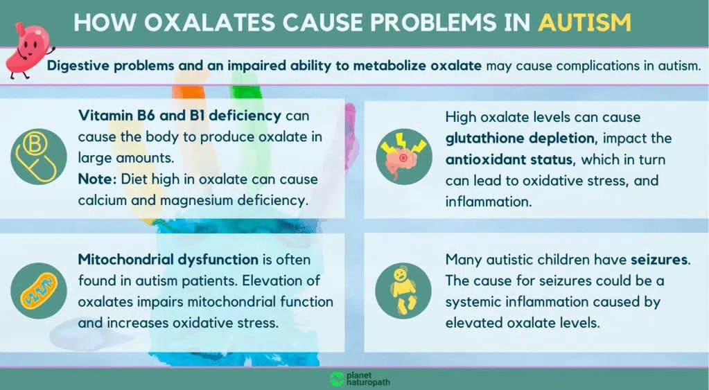There is also a direct link between autism, impaired digestive capacity, and oxalate metabolism. High oxalate levels cause such health conditions as: