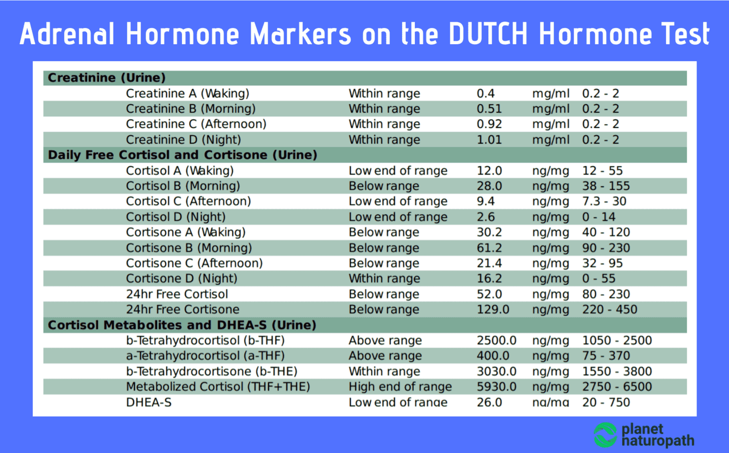 The DUTCH test measures total cortisol production as the rhythm of free cortisol throughout the day, as well as how quickly your body is metabolizing cortisol into cortisone.