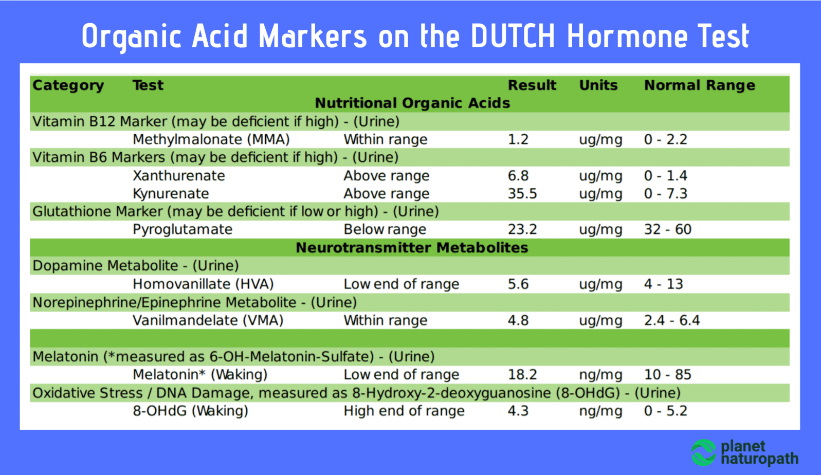 The 10 Organic Acid markers on the DUTCH hormone test don’t replace doing the complete Organic Acids Test which contains over 40 different Organic Acid markers, but the new markers on the DUTCH hormone test do add some valuable information to an already great test.