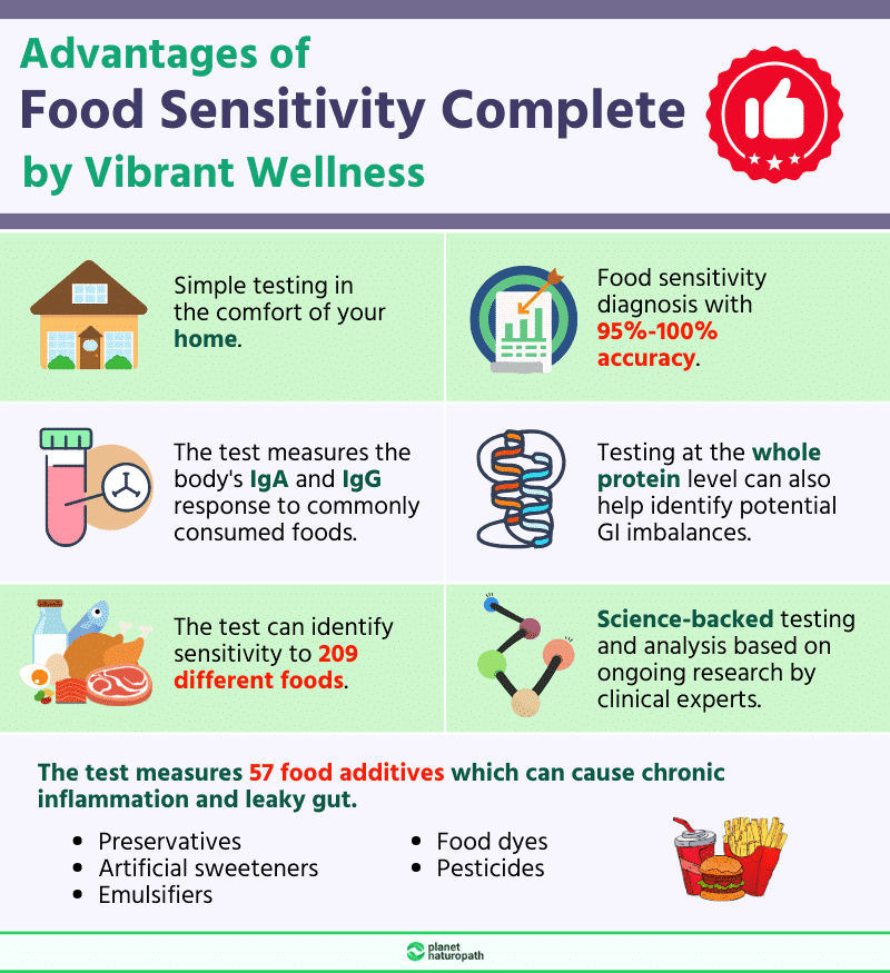 - The Vibrant Wellness Food Sensitivity Complete Test measures IgG and IgA immune responses to 209 foods and 57 additives.