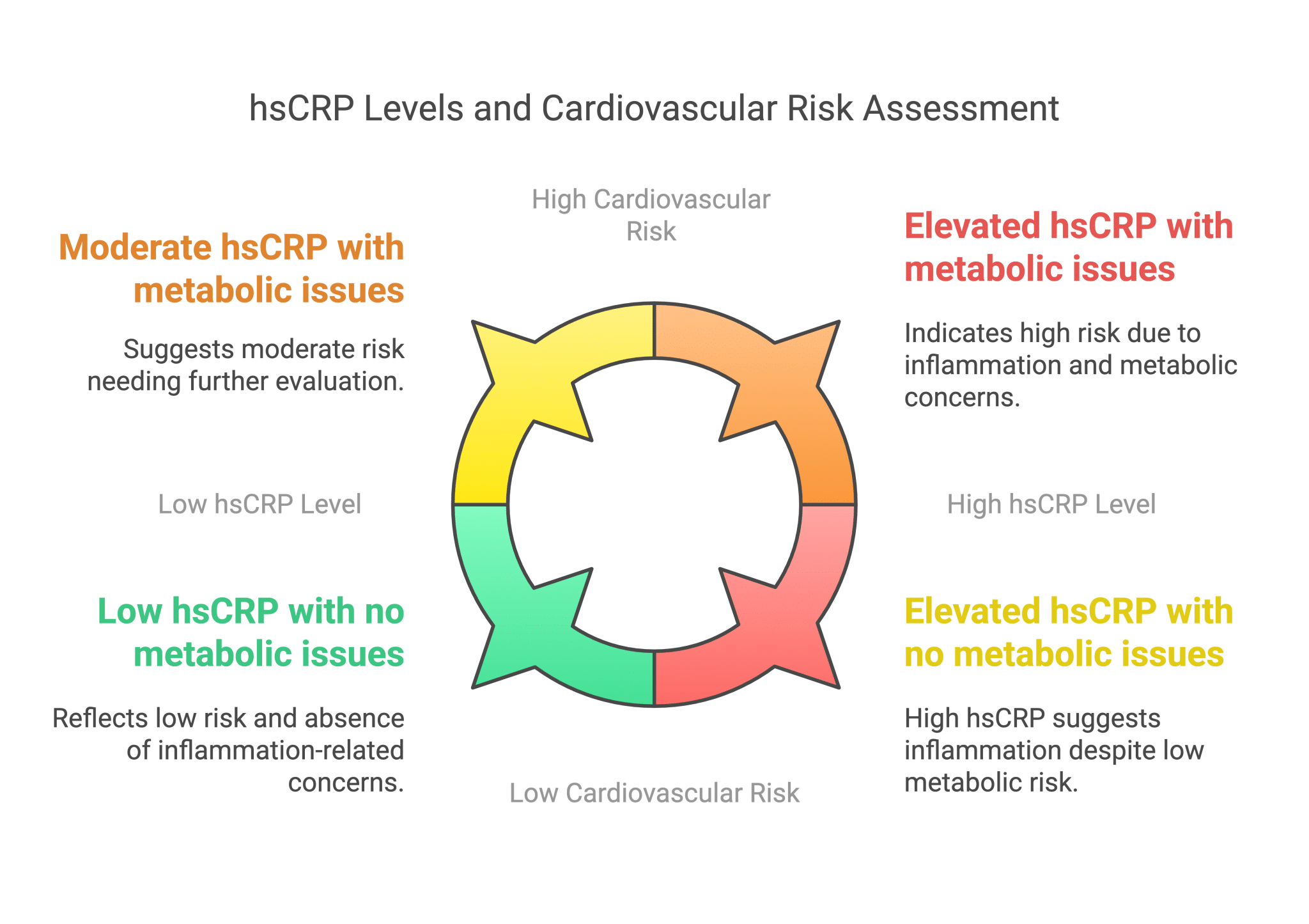 Who should test: Anyone with metabolic issues, high cholesterol, or an unclear cardiovascular risk. hsCRP is particularly useful for individuals at intermediate risk based on traditional risk factors, as it can help refine risk assessment and guide treatment decisions.