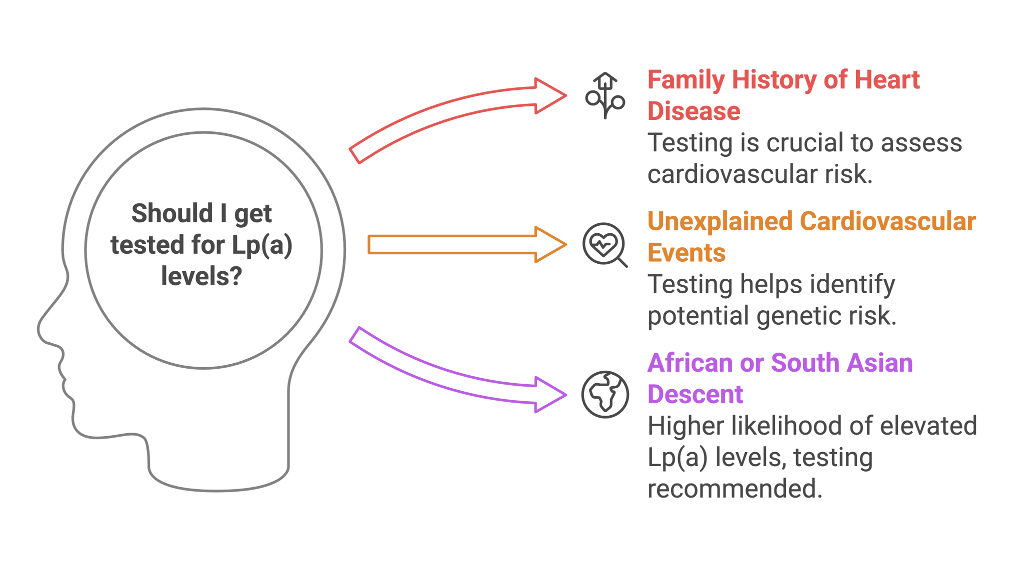 Who should test: Anyone with a family history of heart disease or unexplained cardiovascular events at a young age. Testing is especially important for individuals of African or South Asian descent, who tend to have higher Lp(a) levels.