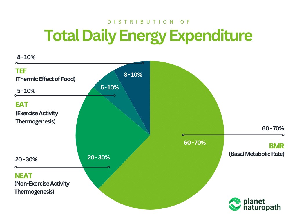 About 5-10% of your daily calorie expenditure comes from digesting and processing the food you eat—known as the Thermic Effect of Food (TEF).