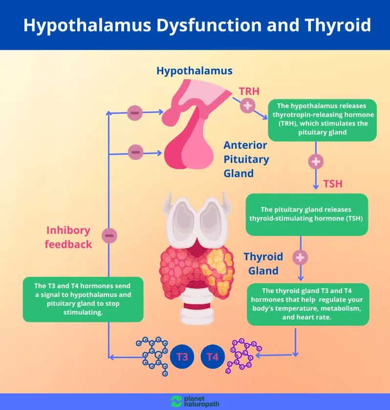 The hypothalamus releases a hormone called thyroid releasing hormone (TRH) which goes to the pituitary, the pituitary then releases thyroid-stimulating hormone (TSH) which signals to the thyroid that the body is low in active thyroid hormones and it needs to make more.