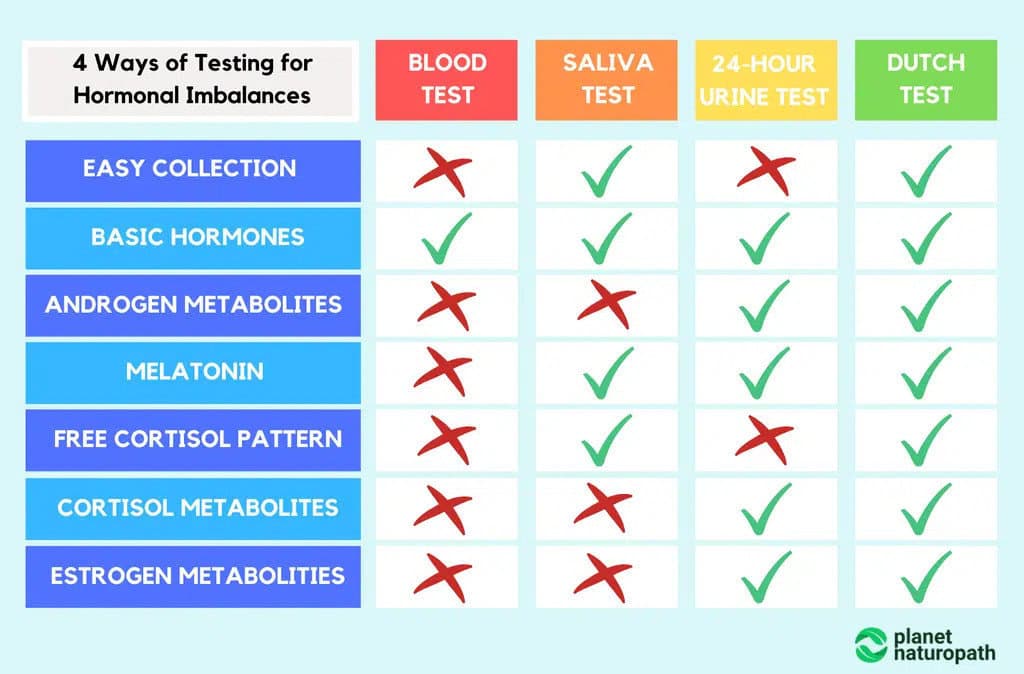 These hormones can be tested in a blood test, but in the DUTCH hormone test they are tested in a lot more detail – here is a list of the hormones tested, and many of them are unique to the DUTCH test.