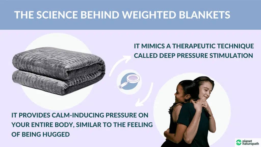 Weighted blankets apply firm pressure over the entire body. This therapy is more known as deep pressure stimulation, that can also come from massage, or cuddling. Deep pressure stimulation regulates the nervous system and promotes hormonal changes that can be beneficial for your sleep, mental health, and overall health.