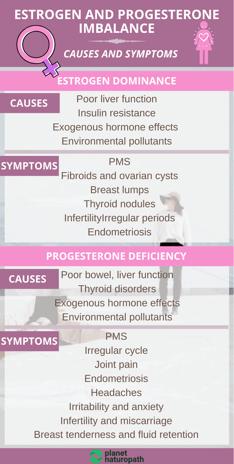 The most common imbalance is an excess of estrogen compared to progesterone which is known as estrogen dominance, this can obviously be caused by the body making too much estrogen or you may have normal estrogen but not enough progesterone.